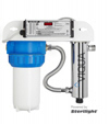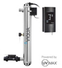 Ce dispositif est installé à l'entrée d'eau que l'on branche sur la conduite principale et qui désinfecte ainsi toute l'eau de la maison. Son procédé de désinfection consiste à faire passer de l'eau à travers une source lumineuse (l'ampoule) qui émet des rayons UV entre 200 à 390 nm (nanomètre), la longueur d'onde optimale de 254nm éradique les micro-organisme telle que les virus, bactéries, parasite, algues, levure, moisissure, E coli, Protozoaires, kystes Cryptosporidium et les kystes Giardia etc. Cette lampe est protégée par une gaine qu'on nomme le quartz. Elle renferme du mercure et un gaz inerte, généralement de l'argon. L'énergie électrique, apportée par un ballast (composant assurant le démarrage de la lampe et contrôlant la puissance électrique transmise), ionise les vapeurs de mercure à un niveau d'énergie générant un rayonnement UV. La lampe est placée dans un manchon (sleeve) transparent, l'eau circulant en couche mince, entre celui-ci et la gaine de quartz, car elle absorbe très rapidement l'énergie du rayonnement UV avant d'être distribué dans toute la maison. Tous les stérilisateurs viennent avec une boîte électronique qui offre différentes options par rapport à certain modèle.